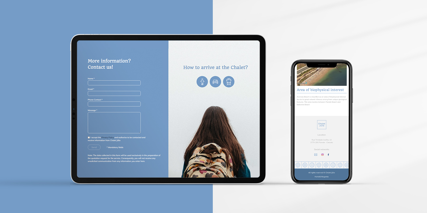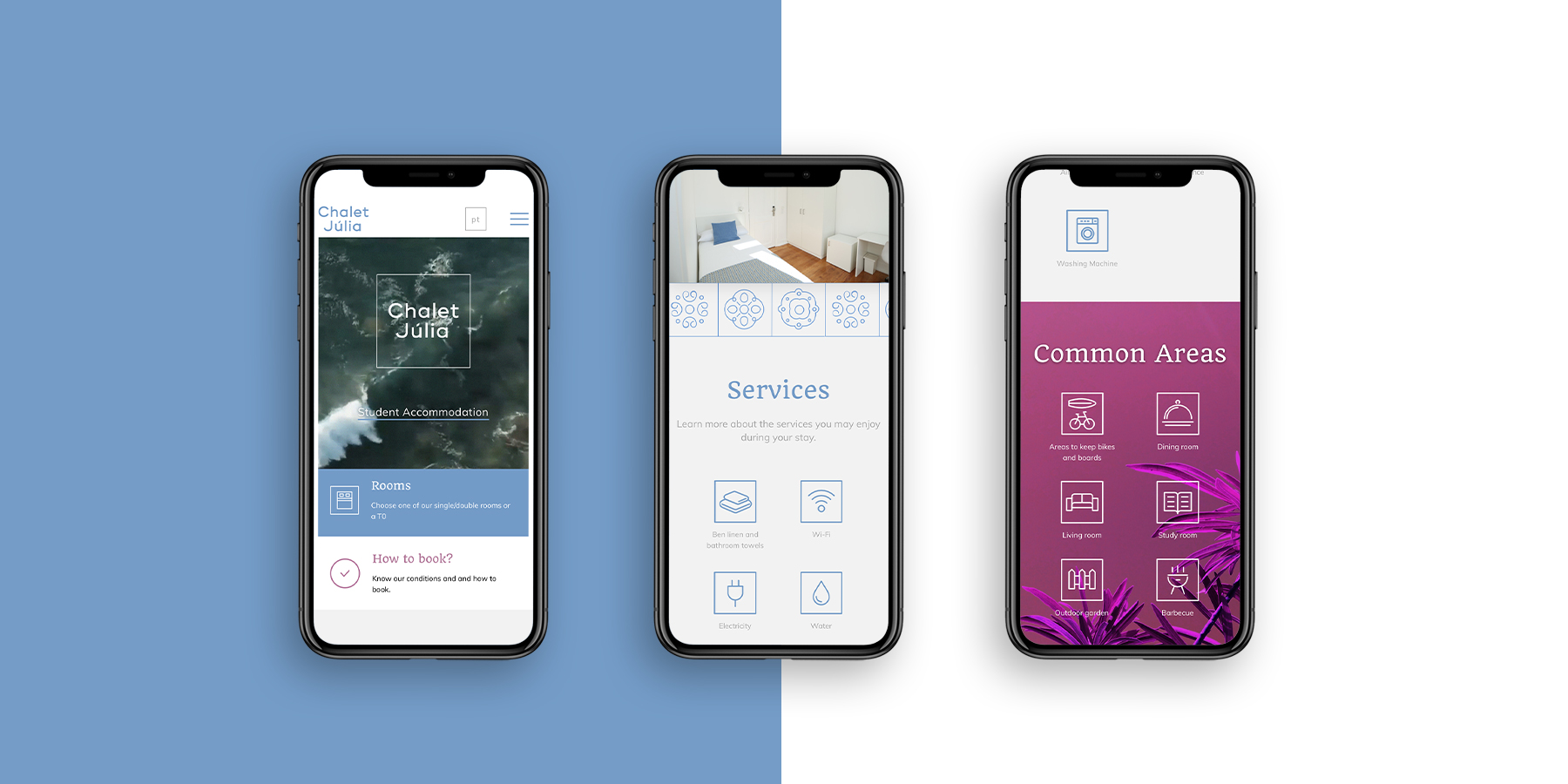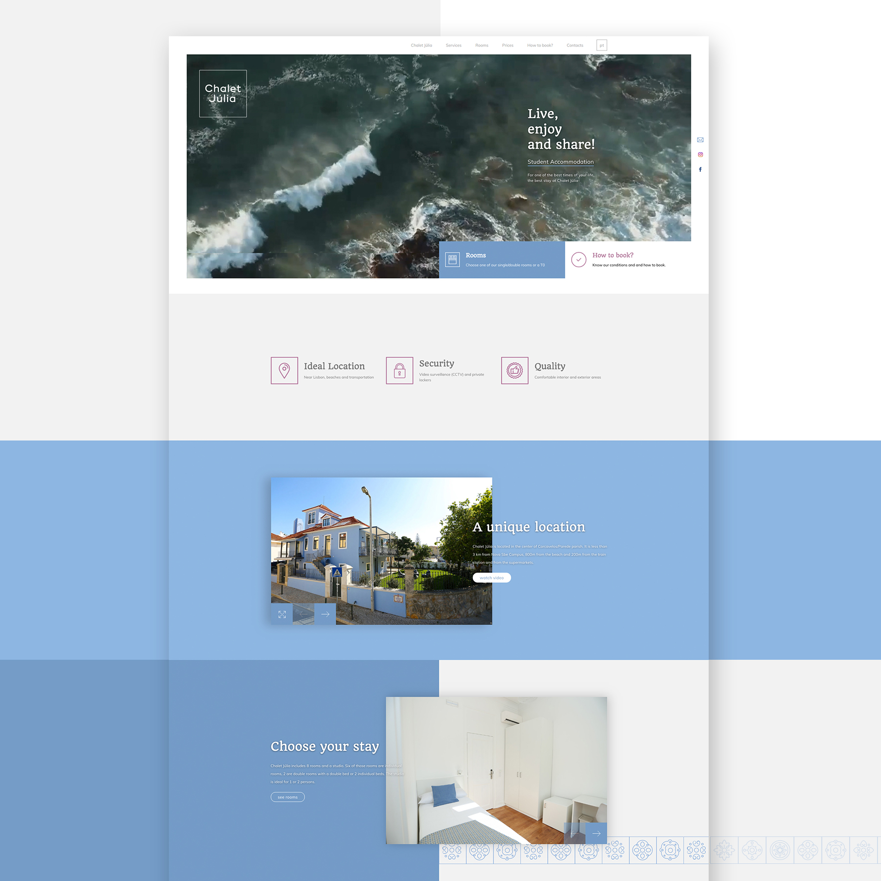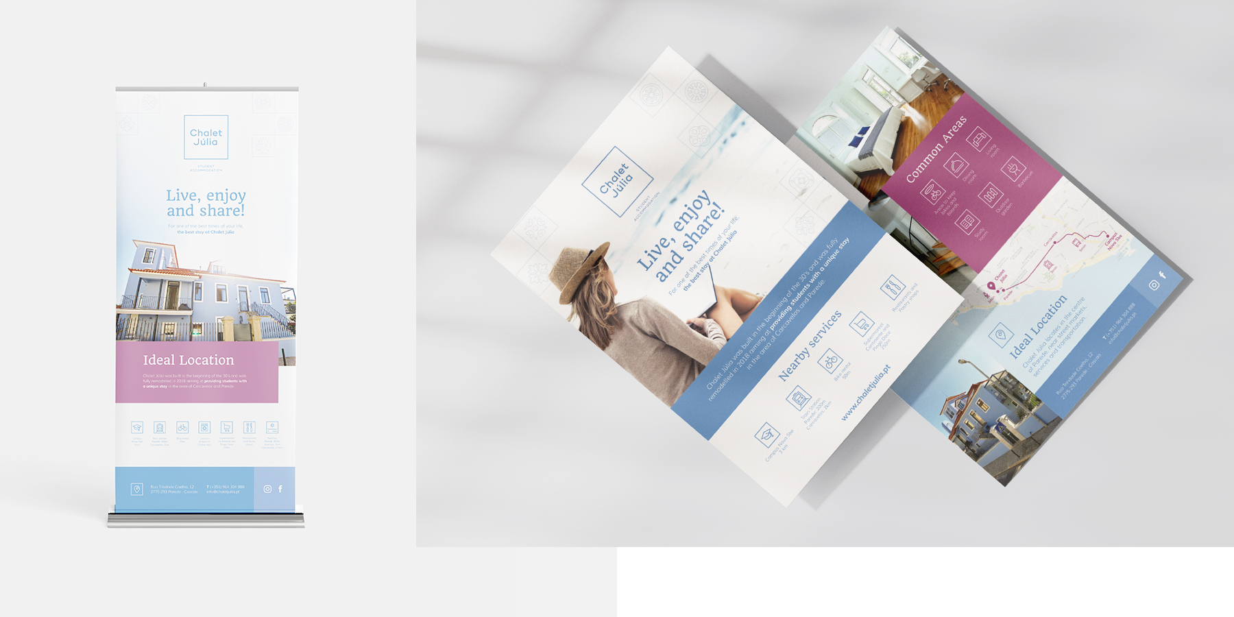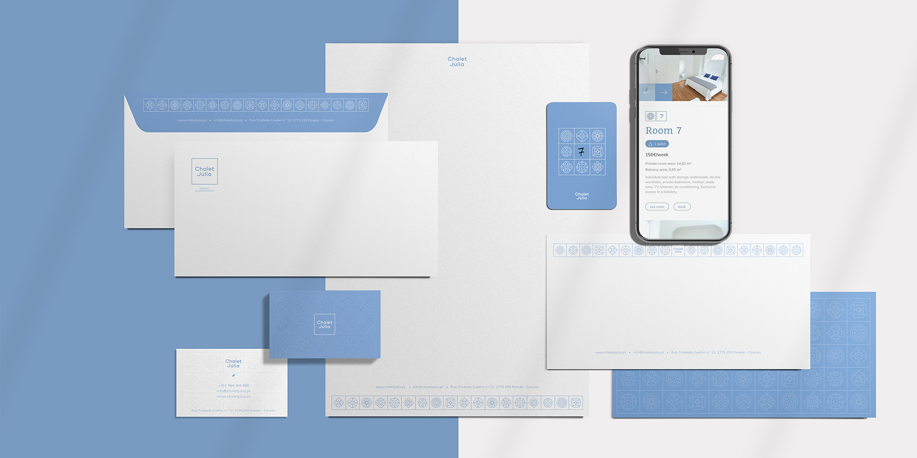 Built in the 1930s, the Chalet was the house of José Saramago (Nobel Prize for Literature). In order to preserve this history, it was created a graphic identity based on the original tiles, which still exist. In 2018, it was remodeled for the stay of university students from Nova SBE, in the region of Carcavelos / Parede. The building also received a new color on the facade.