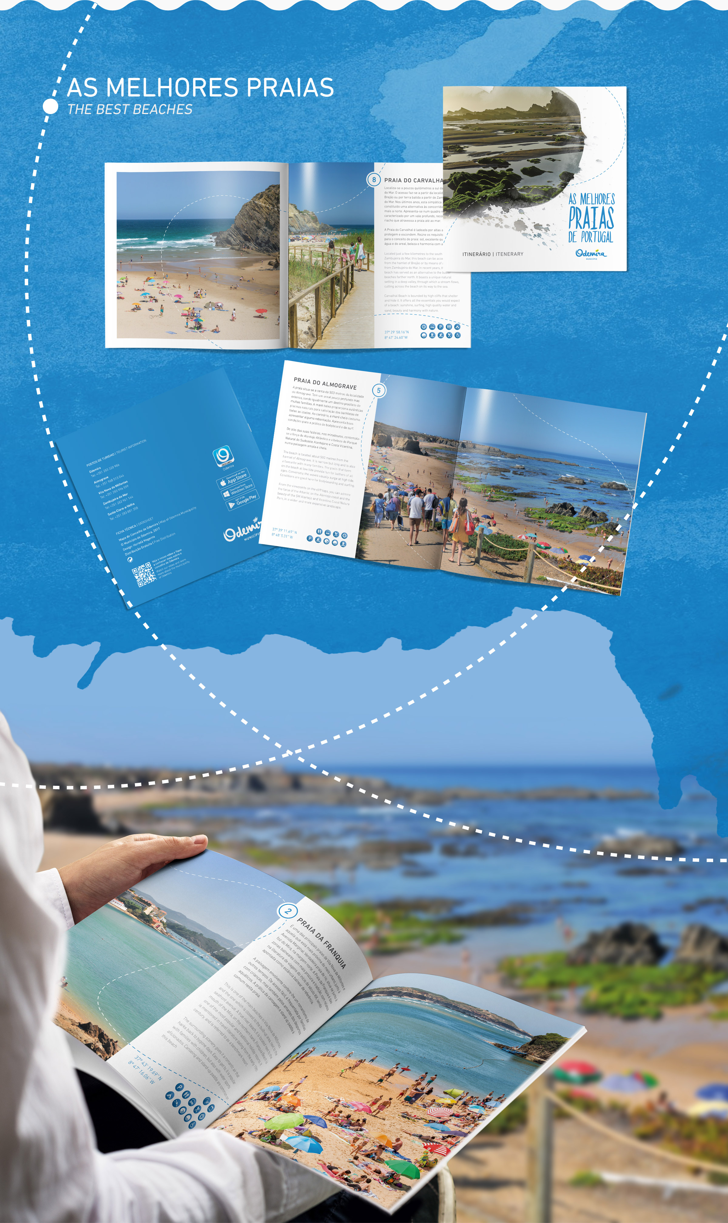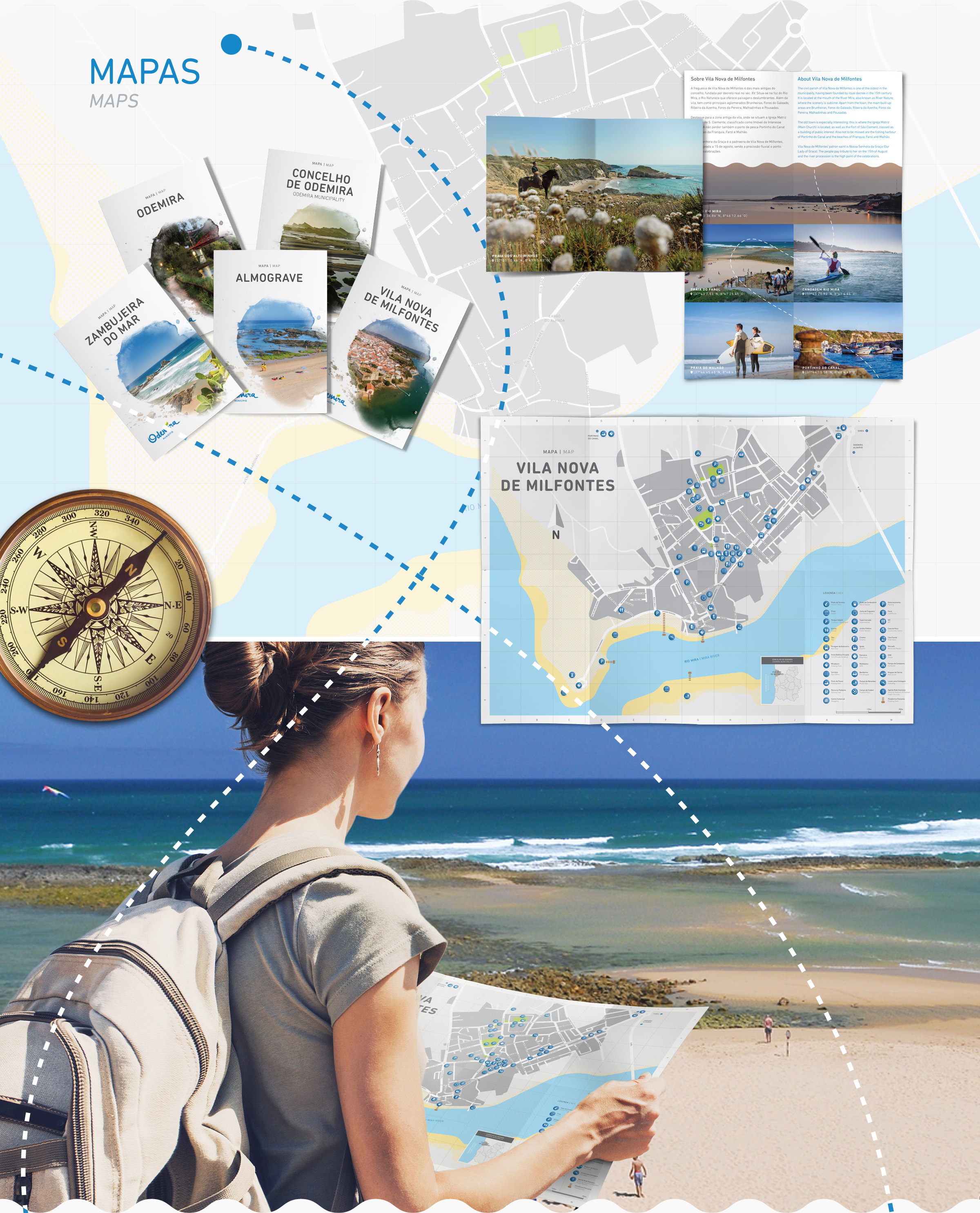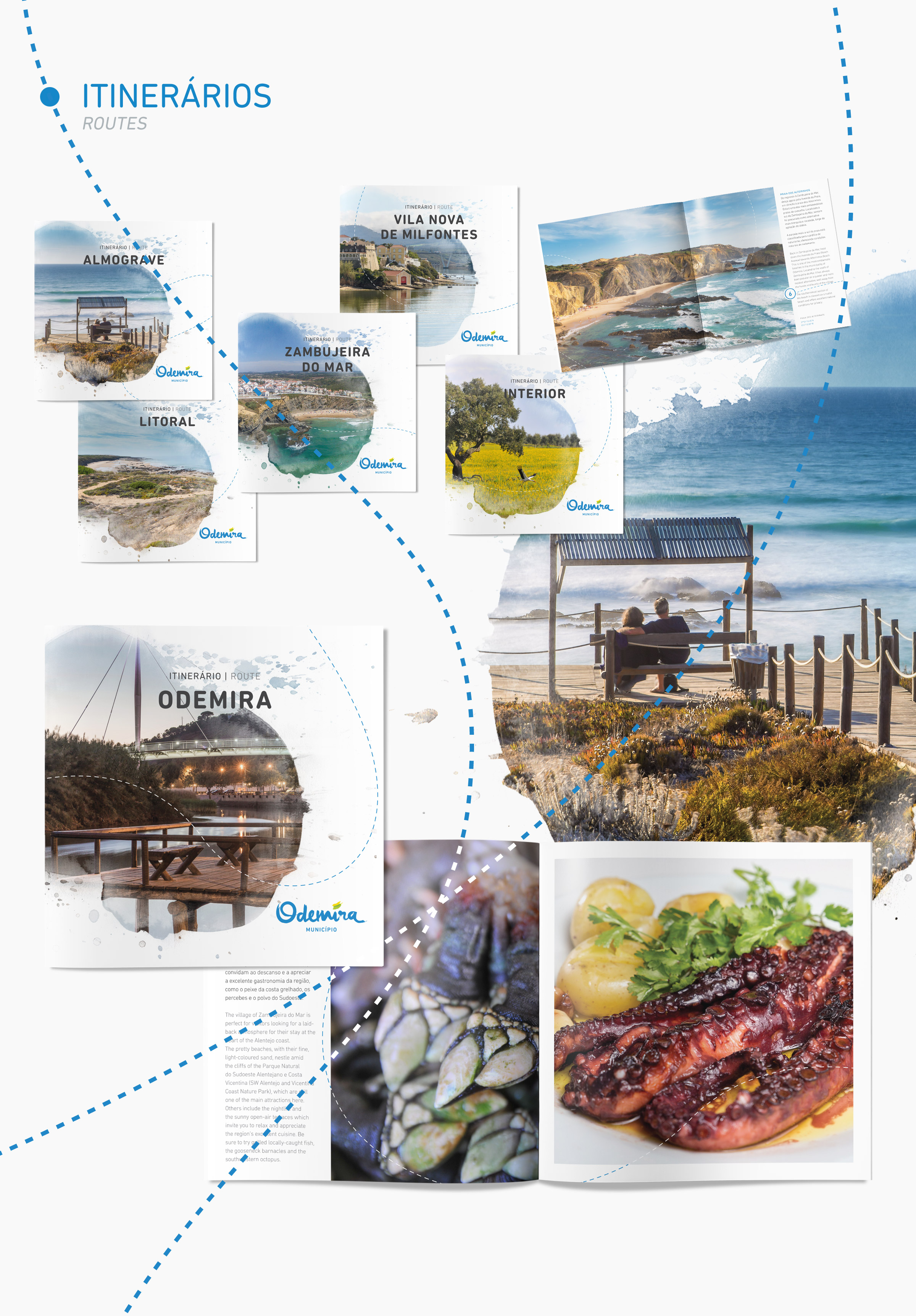 Com o litoral alentejano cada vez mais em voga, o município de Odemira teve a necessidade de repensar e fazer novos guias turísticos da região. Execução de uma nova abordagem gráfica com informação actualizada, desenho de novos mapas, roteiros, itinerários e percursos pedestres.